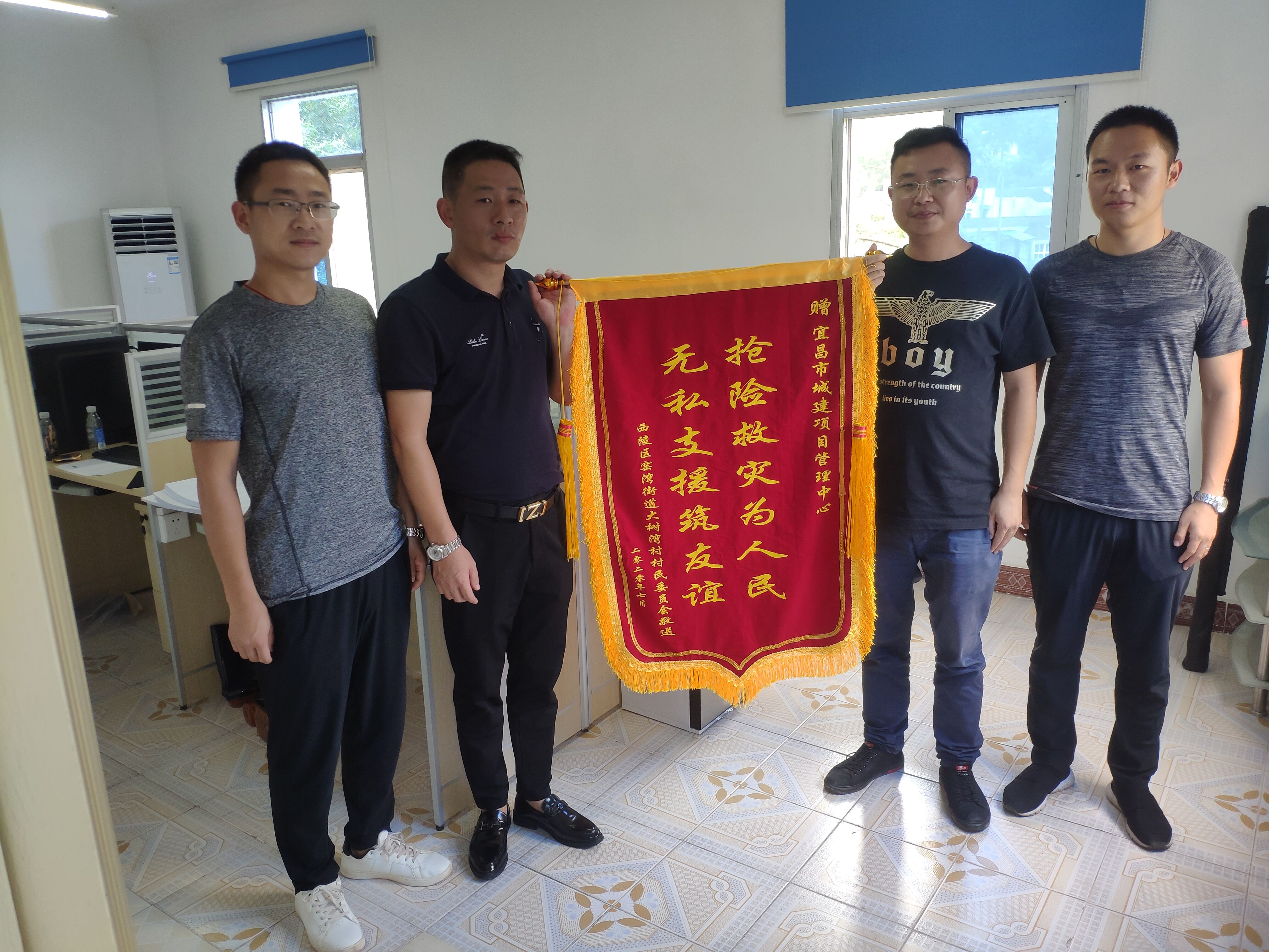 7月22日,西陵区窑湾街道大树湾村村委会班子成员来到市城建项目管理中心港窑路项目部,将印有“抢险救灾为人民,无私支援筑友谊”的锦旗送到市城建项目管理中心业主代表董军、杨凡手中,对项目中心在抢险救灾中所做的工作表示感谢。