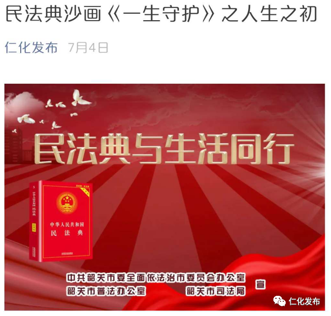 此外,仁化县充分利用互联网传播优势,在“仁化发布”“文明仁化”“仁爱仁化”等媒体平台持续发布《民法典》学习内容、《民法典》公益宣传片以及民法典沙画《一生守护》。截至目前共推送27条民法典相关推文,以亮点梳理、趣味漫画、律师解答等群众喜闻乐见、通俗易懂的展现形式,形成线上线下相呼应、同频共振的良好宣传效果,进一步增强了人民群众学法守法意识,为全民普法学法营造了良好氛围。