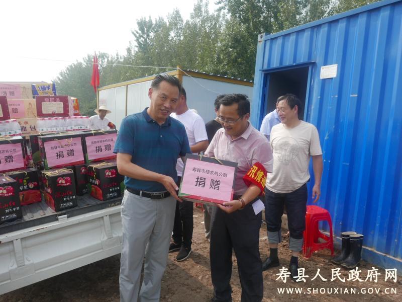 7月31日下午,寿县丰硕农业机械销售有限公司总经理张有春到九里联圩看望慰问农口段一线防汛人员,送去了方便面、矿泉水、水果等慰问品。
