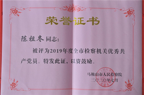 陈祖冬获2019年度全市检察机关优秀共产党员称号