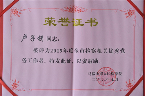 卢子铸获2019年度全市检察机关优秀党务工作者称号