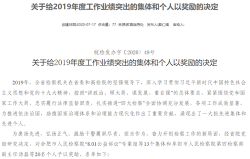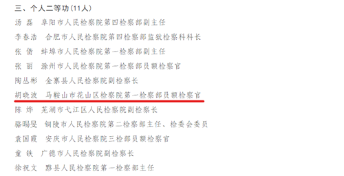 根据省院发布的《关于给2019年度工作业绩突出的集体和个人以奖励的决定》(皖检发办字〔2020〕49号),花山区检察院第一检察部员额检察官胡晓波被省院荣记“个人二等功”。