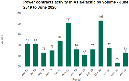 据GlobalData的电力数据库显示,2020年6月,亚太地区电力行业合同公布了73份,比过去12个月平均值80份下降了9%。