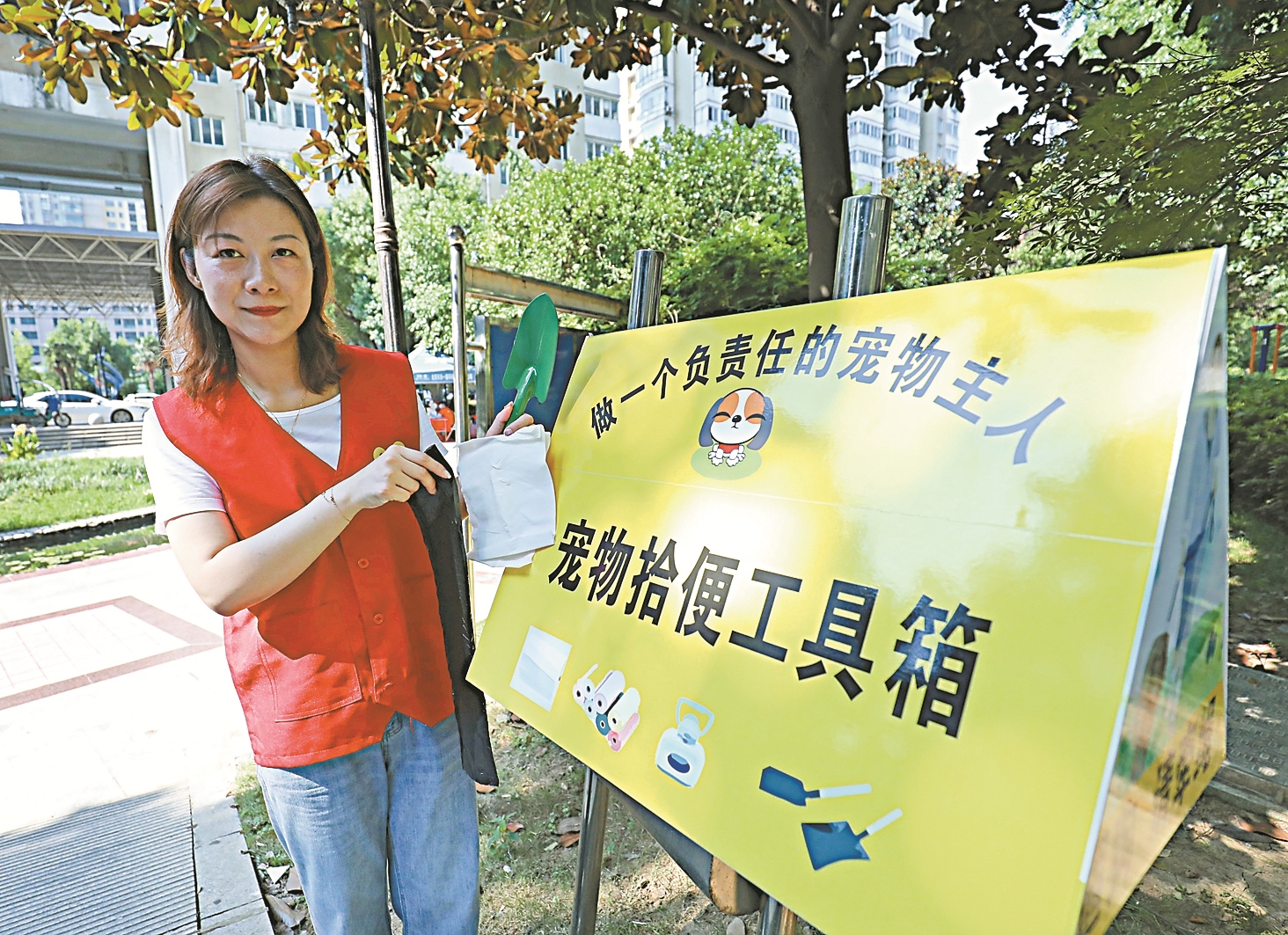 8月5日,家住南湖社区中央花园的居民发现,在小区中心广场多了一个黄色的“小木屋”,内部配备有小铁锹、卫生纸和塑料袋,方便犬主清理狗狗粪便。据了解,为了维护小区公共环境卫生,同时也为了方便养狗的居民,湖东路街道南湖社区联合辖区物业创新思路,在小区休闲广场设置了一只这样的“宠物拾便工具箱”。