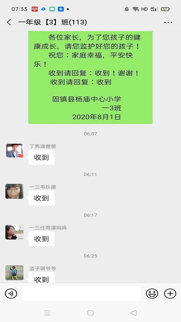 为进一步加强学生安全教育,增强学生的防溺水安全意识。杨庙中心小学组织班主任和教师定期通过班级微信群,向学生和家长发送暑假防溺水温馨提醒,做到学生安全有人守,学生安全有人说,让学生和家长过一个安全、幸福的暑假。