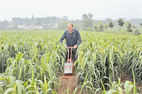 夏日午后,在和顺县牛川乡崔家坪村的谷子连片种植基地里,一串串谷穗嗅着香甜的空气,醉得弯下了腰身。三三两两的村民们正忙着对谷物进行除草和施肥,现场机器的轰鸣声与村民的欢笑声奏出了一支夏日农忙的交响曲。