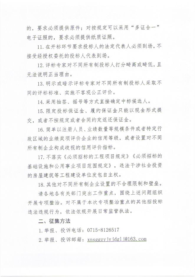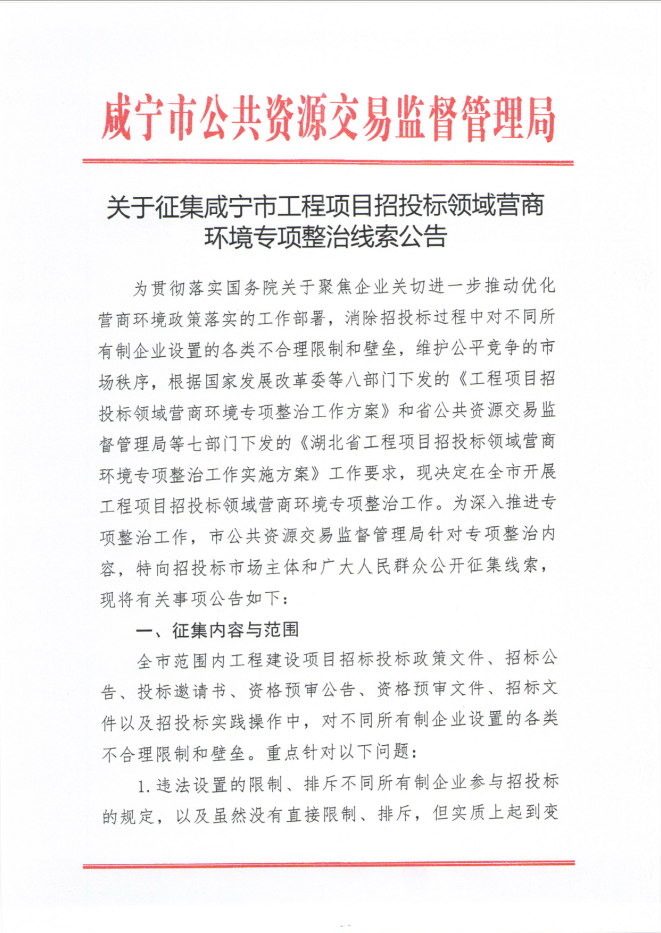 关于征集咸宁市工程项目招投标领域营商环境专项整治线索公告