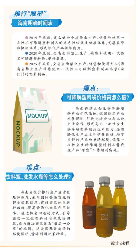 按照“限塑”工作安排,海南将分步骤、分阶段组织重点行业和场所率先开展“限塑”试点工作,从而为今年年底正式全面禁止一次性不可降解塑料制品的实施打好基础。