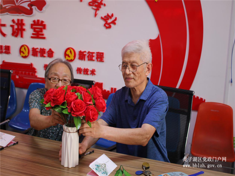 活动第二个环节是手工玫瑰花制作。志愿者给大家分发了准备好的材料,在志愿者的指导下,大家一步步做起来,不一会儿,一朵朵娇艳欲滴的“鲜花”就出现在众人的眼前,再加上几片绿叶,简直栩栩如生,夫妻两个人共同把做好的玫瑰花放到准备好的瓷花瓶里面,并表示感谢另一半的理解和不离不弃。