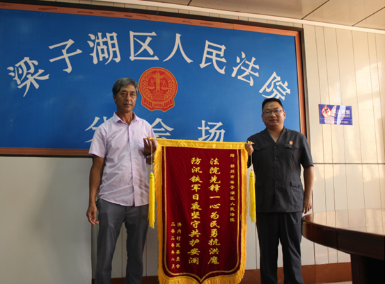 (本网讯)“面对严峻的汛情,法院干警冲在最前、日夜奋战,东井大圩能够平安度过汛期,你们法院干警功不可没!我代表洪内村全体村民感谢你们!”8月18日上午,沼山镇洪内村六名村民代表满怀感激之情,为梁子湖区法院送来“法院先锋一心为民勇抗洪魔,防汛铁军日夜坚守共护安澜”锦旗。