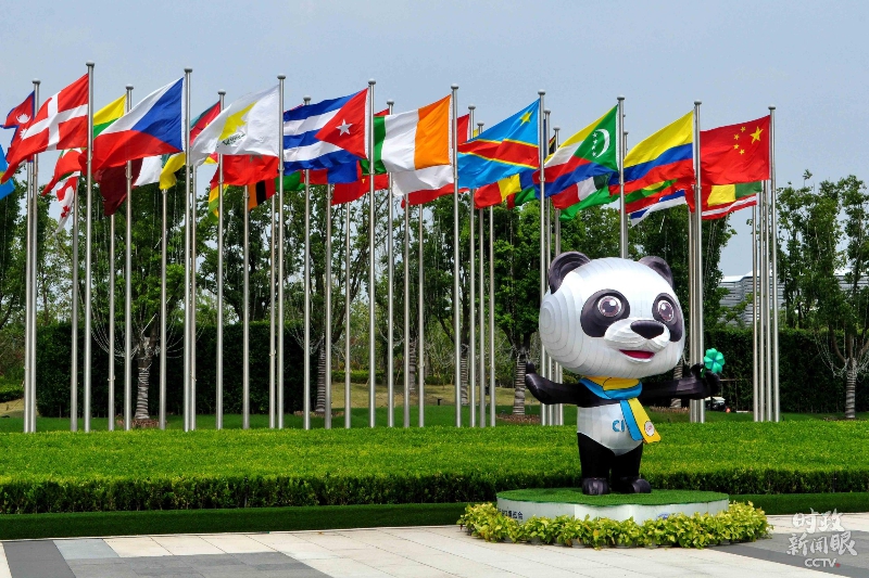 △7月27日,第三届进博会倒计时100天,场馆外参展国国旗飘扬。