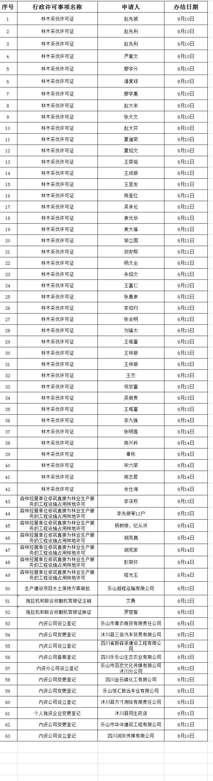 沐川县行政审批局8月10日-8月14日审批结果公示(二)