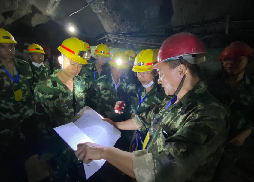 到达团家洞金矿后,县指挥部听取了凯鑫公司介绍近年来的发展情况,并观看了该公司的对外宣传片。随后全体人员全副矿工装备乘车深入矿井底部,步行约1公里来到垂直深度300多米的综采工作面。对矿洞高度、井下设施设备、省四0二工作队资源储量核实工作进展情况等进行详细了解。升井后,汤电辉要求凯鑫公司全力配合此次核查工作,同时要求省四0二队将安全摆在首位,抓紧时间、工作严谨,全力以赴做好资源储量核实工作,确保按时、按质完成工作任务。