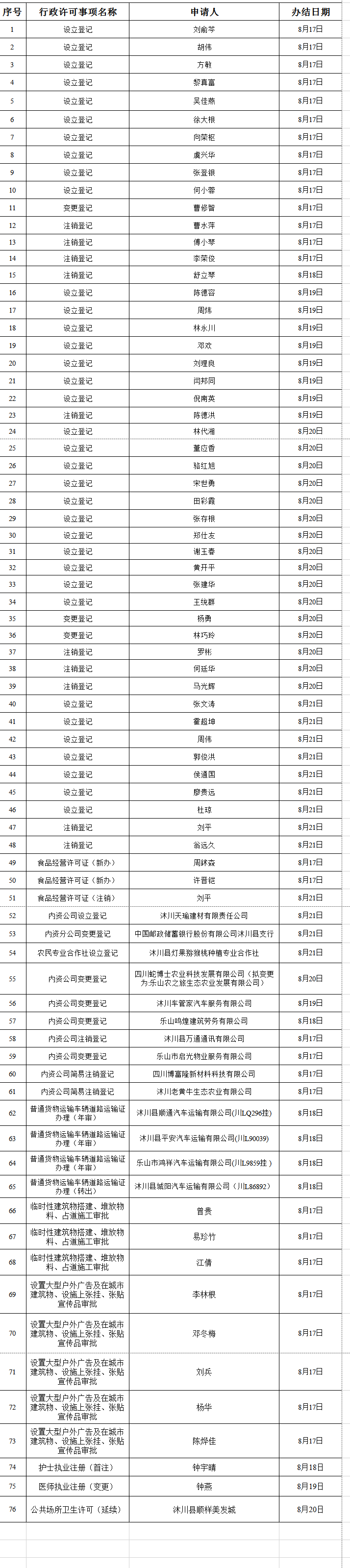沐川县行政审批局8月17日—8月21日审批结果公示(一)