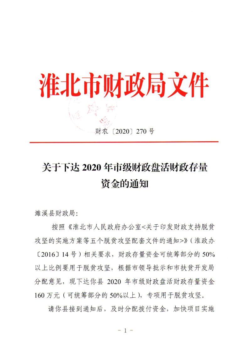根据安徽省扶贫办、安徽省财政厅《关于完善扶贫资金项目公告公示制度的实施意见》(皖扶办〔2018〕118号)和《安徽省扶贫项目管理暂行办法》(皖扶办〔2018〕116号)文件要求,为进一步加大信息公开力度,强化扶贫资金监管,现将下达2020年市级财政盘活财政存量资金予以公告。
