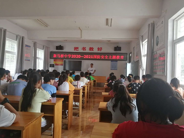 按照新马桥中学政教处新生军训期间专题教育工作安排,2020年8月26日中午12点半,固镇县新马桥中学在教职工会议室给前来参加军训的新生进行了国防教育专题讲座,会议由政教处主任郭传辈主持,学校工会主席徐其明给新生进行了国防教育专题讲座。