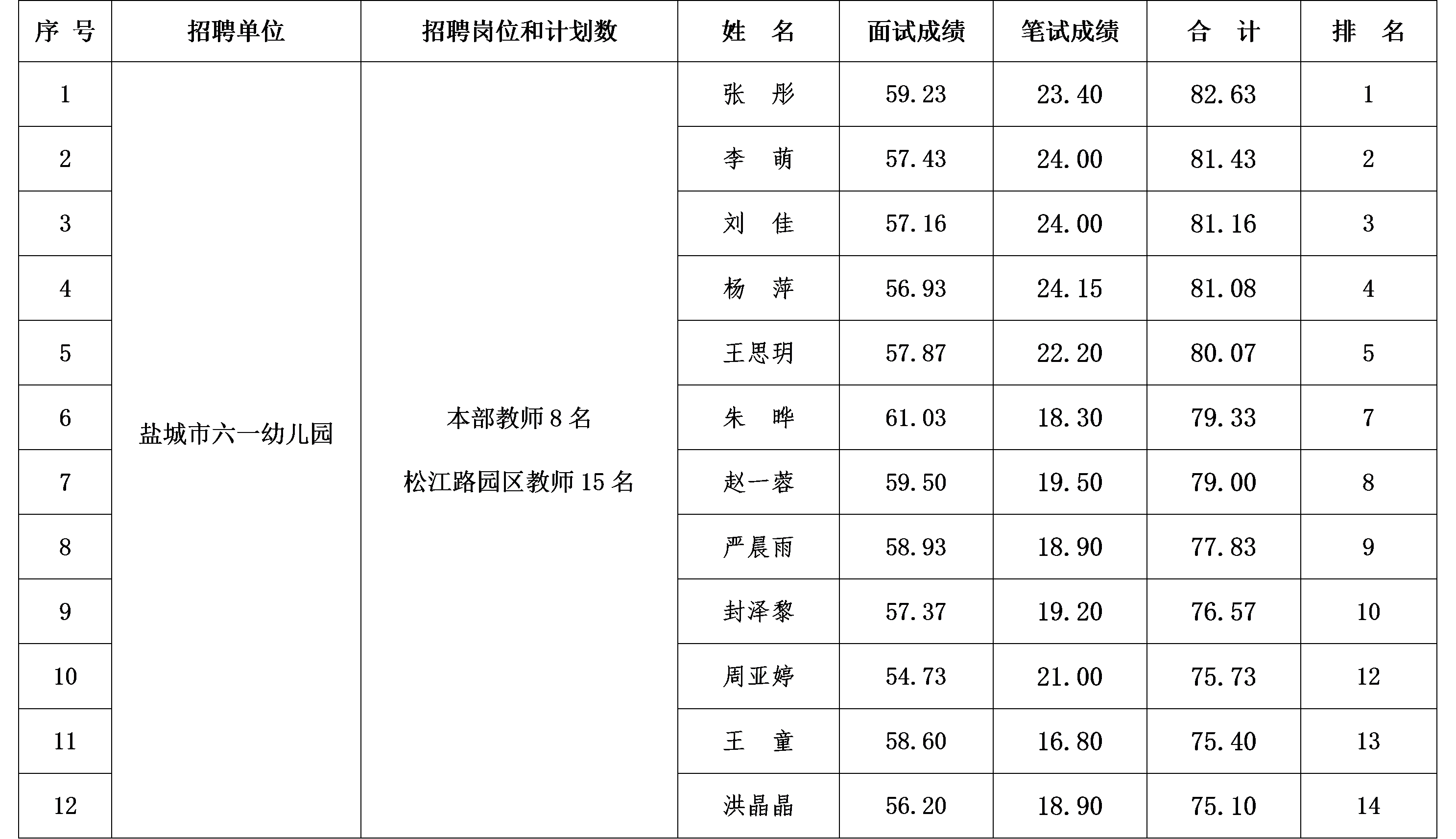 盐城市六一幼儿园2020年公开招聘教师拟聘用人员名单公示