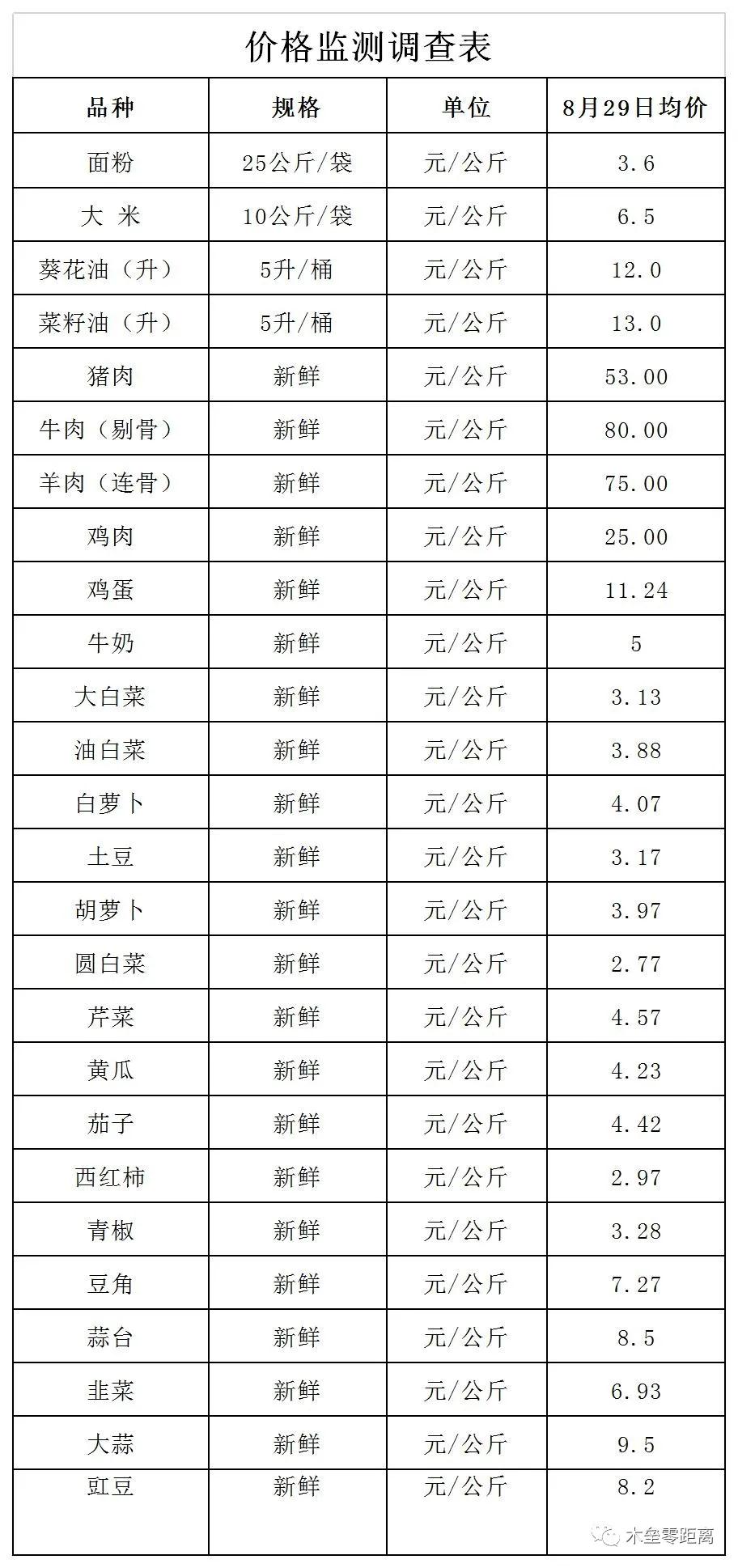 8月29日木垒县主要农副产品市场均价公示