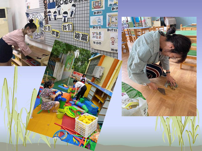 各幼儿园组织教职工对幼儿园大厅、走廊、户外活动场地等重点区域以及班级进行环境卫生清洁,对班级幼儿用品进行全面消毒整理,做到不留死角、不留盲区。同时,为了给孩子们创设一个优美温馨的环境,教师们利用午休时间用自己的巧手装饰幼儿的环境。