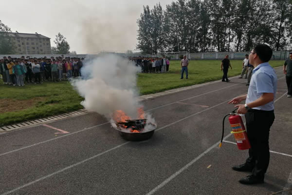 8点55分,伴随着警报声,学生开展疏散演练。随后,在操场进行消防技能培训,模拟火灾场景,演示灭火器使用方法,并由师生代表现场操作灭火过程。