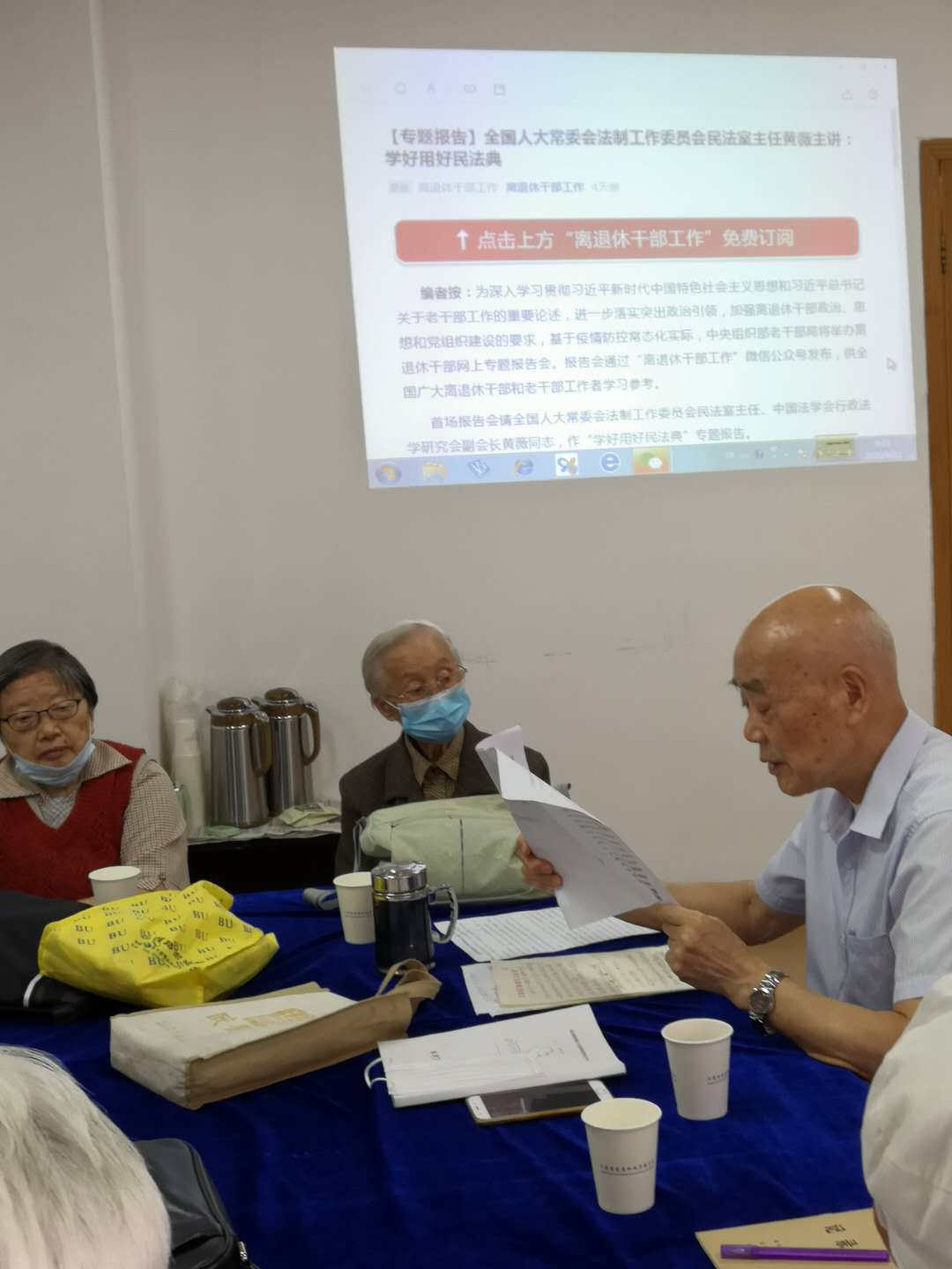 9月11—28日,委退休干部各党支部分批组织开展党日活动,集中学习近期习近平总书记在纪念中国人民抗日战争暨世界反法西斯战争胜利75周年座谈会、全国抗击新冠肺炎疫情表彰大会、新疆工作座谈会上的重要讲话精神,还学习了省委省政府关于深入推进美丽江苏建设的意见。学习结束后,各支部组织观看了全国人大法制工委民法室主任黄薇主讲的《学好用好民法典》报告会录像。通过学习,大家一致表示,按照委党组和机关党委的部署要求,支部在条件允许的情况下,要认真学习习近平总书记的重要讲话精神,深刻领会推进美丽江苏建设的意义和内涵,深刻理解抗击新冠肺炎疫情取得阶段性成果对全面进入小康的非凡意义,切身体会到党中央的英明决策、中国人民的伟大力量,更加紧密团结在以习近平同志为核心的党中央周围,更加牢固的树立“四个意识”、坚定“四个自信”,切实做到“两个维护”,自觉在思想上、政治上、行动上同党中央保持高度一致。