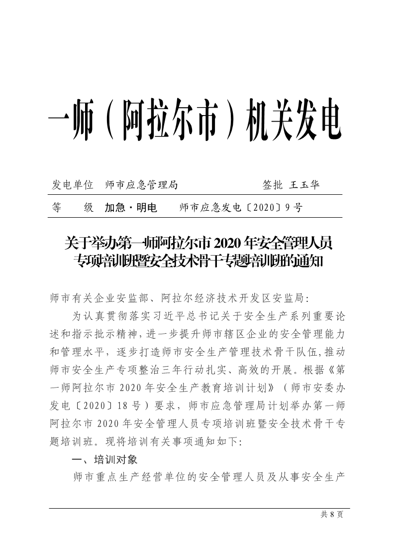 关于举办第一师阿拉尔市2020年安全管理人员专项培训班暨安全技术骨干专题培训班的通知