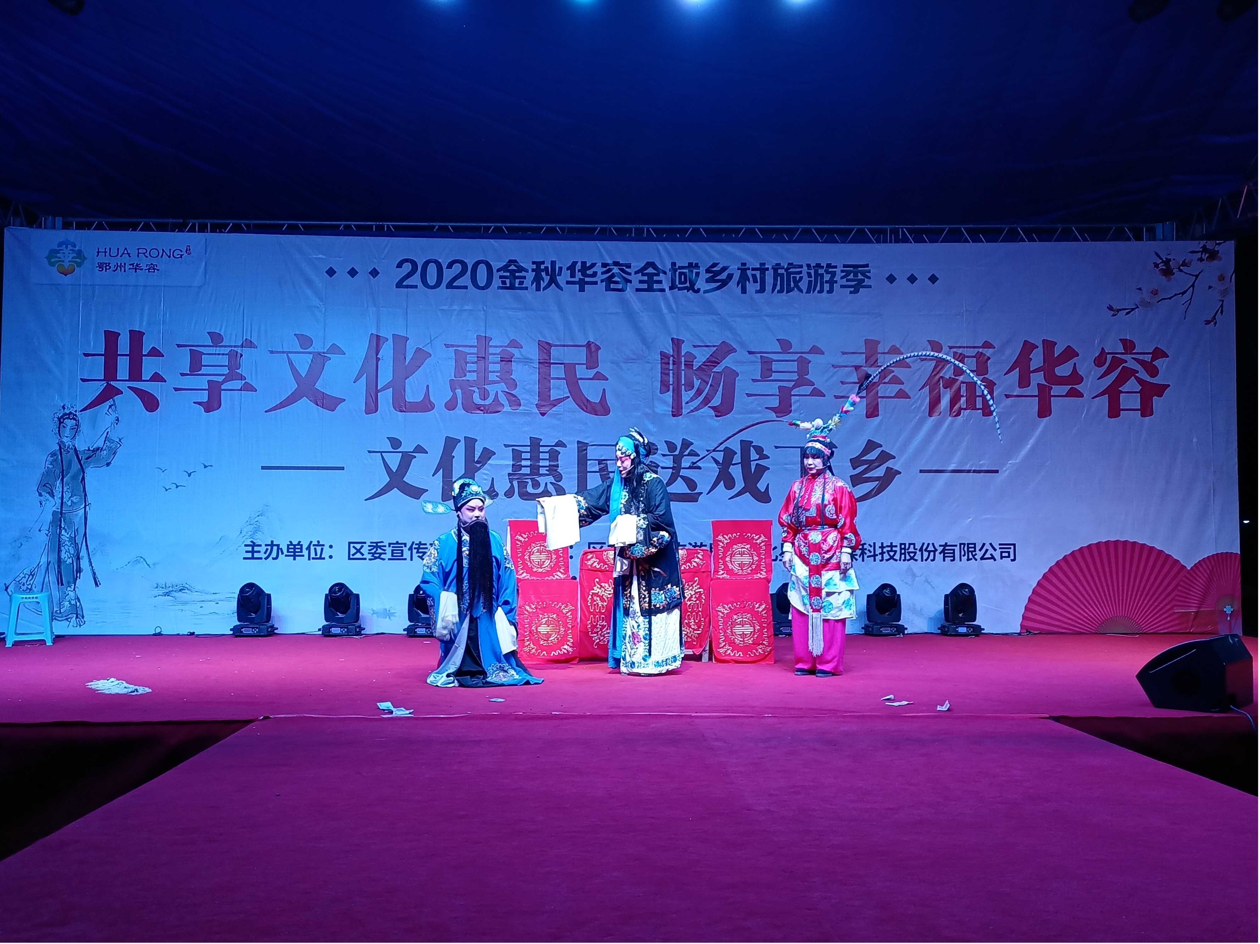 为丰富全区人民节日期间文化生活。10月2日、5日和7日晚,由区委宣传部主办、区文化和旅游局、区文化馆承办的2020金秋华容全域乡村旅游季“文化惠民、送戏下乡”活动分别在段店镇台创园、蒲团乡石竹月季园和华容广场隆重举行。为广大戏迷朋友和游客送上了一场精彩的传统文化盛宴,让老百姓在家门口就能尽享文化大餐。