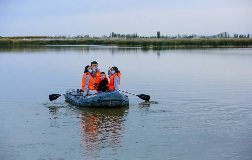 10月3日,记者在五工台镇百泉湖湿地景区看到,百泉湖湿地水波荡漾,两岸芦苇随风摆动,各色鲜花争奇斗艳,湿地旁千亩金黄的水稻和碧水蓝天相互映衬,风景如画。游客们在岸边欣赏湿地美景,不时合影留念,纵享假期的惬意时光。