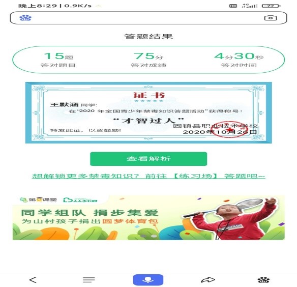 据悉,该校在日常教育教学中非常重视学生的禁毒教育,利用主题班会等形式组织学生观看仿真毒品和禁毒教育视频等,通过视觉、听觉双重感官达到禁毒预防教育的目的;同时,该校又组织学生参加2020年禁毒知识答题活动并做到全覆盖,进一步深入认识毒品危害,提升防毒技能。
