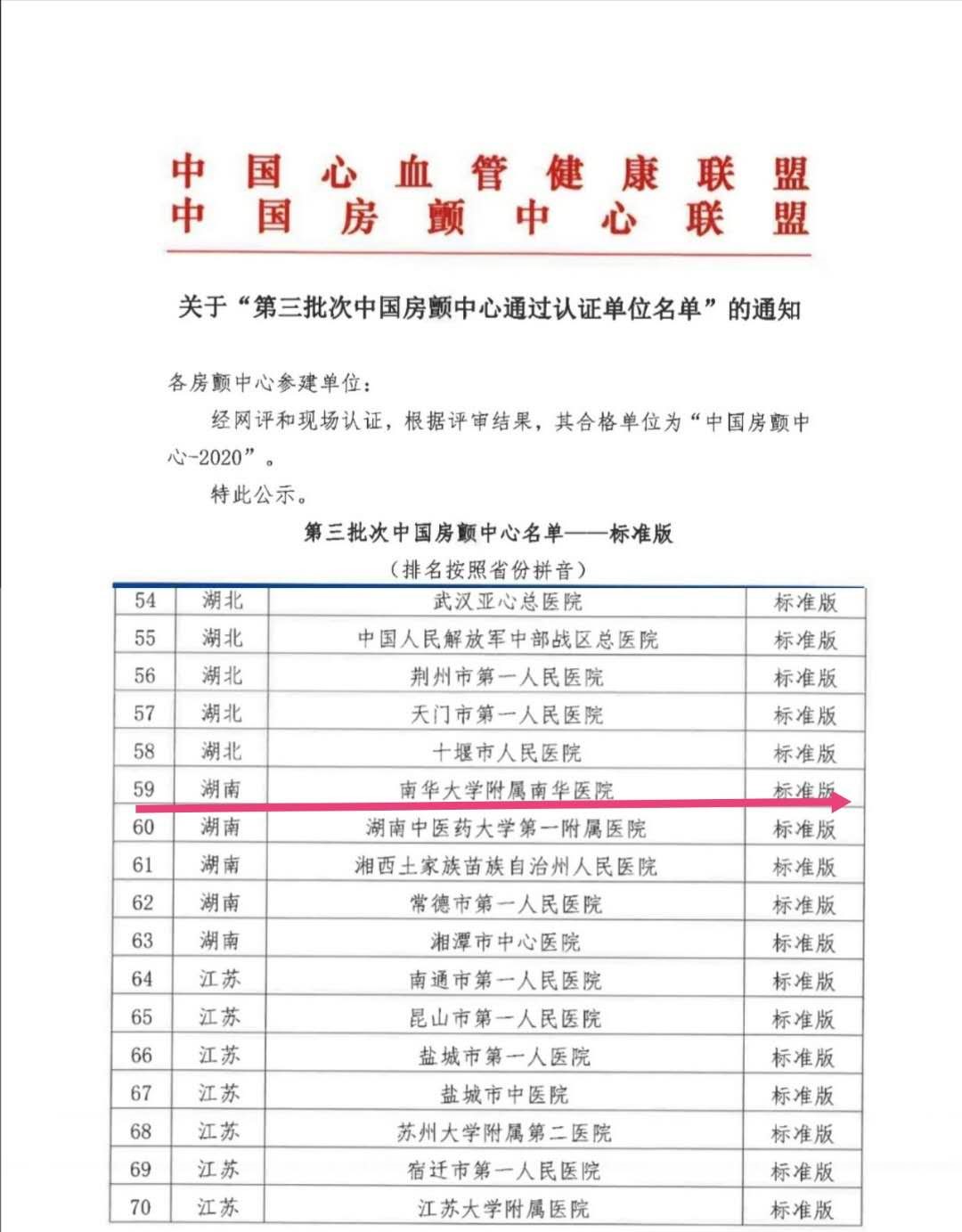 10月28日,中国房颤中心总部公布“第三批次中国房颤中心通过认证单位名单”,南华大学附属南华医院光荣上榜,顺利通过“中国房颤中心(标准版)”认证,成为湘南地区第一家国家级房颤中心。