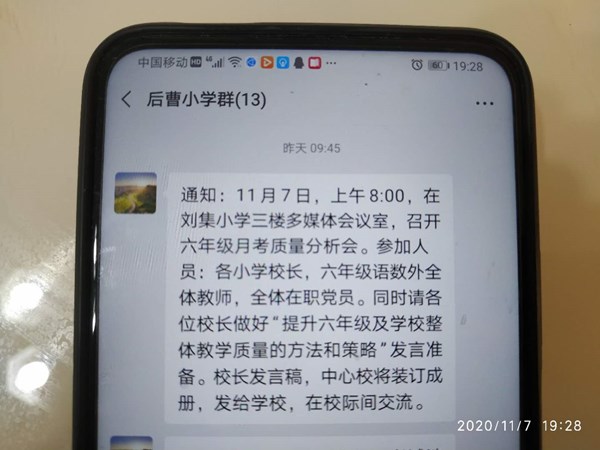 刘集中心校后曹小学组织六年级教师参加中心校月考质量分析会