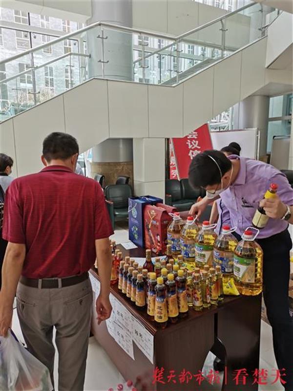 楚天都市报记者在活动现场看到,“赶集会”设置在机关大楼空闲区域,在一楼展区,汉阳辖区企业福达坊的香油、苏泊尔的炊具、百威和黄鹤楼的酒应有尽有;二楼展区销售的是生鲜,一袋袋包装好的鲜桃、一盒盒土鸡蛋和处理好的老母鸡吸引了不少人购买;在食堂一角,摆满了两家辖区餐饮企业提供的特色美食,顾客既可以试吃,也可以现场购买。