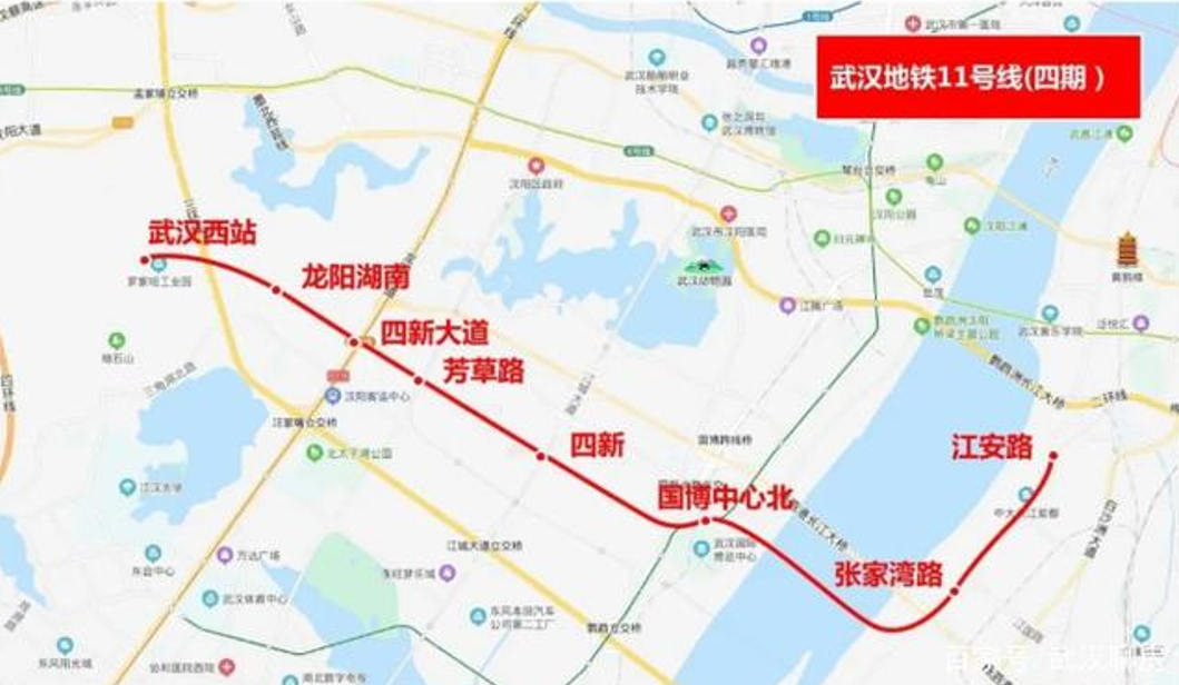 11号线西起于新汉阳火车站(武汉西站),东止于东湖高新区左岭,打通了汉阳西部与光谷横向大动脉,可实现汉阳四新地区与武昌中心区的快速直达。