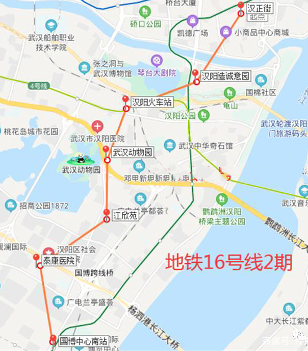 根据规划,地铁16号线2期工程起于国博中心南北延至汉正街,分为两个标段,一个是汉南这边增加一站,连接到通航产业园,二是从国博中心南站沿汉阳江堤中路敷设增加7站到汉正街,它将连接6号线和12号线,串起泰康医院、武汉动物园、汉阳火车站、汉阳造创意园及汉正街核心区域,更加方便汉阳、汉南、汉口三地的交通来往!