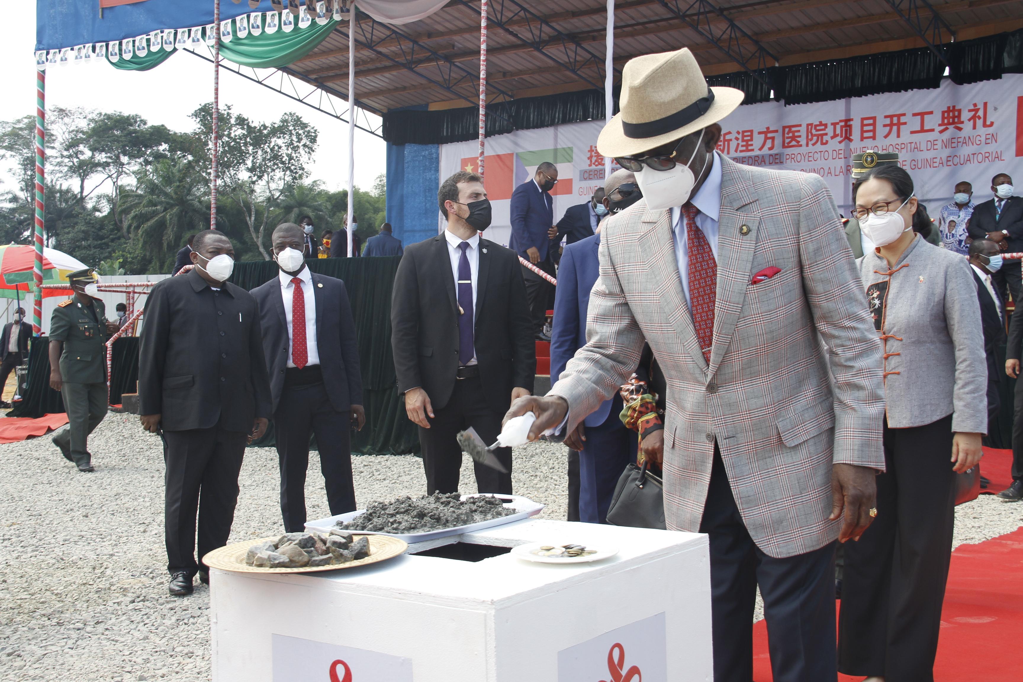 11月30日,赤道几内亚总统奥比昂、第一夫人康斯坦西娅出席中国政府援赤道几内亚新涅方医院项目奠基仪式。驻赤道几内亚大使亓玫、赤几卫生与社会福利部长恩苏埃、公共工程、住宅与城市规划部长费雷罗、中南省省长曼东戈、涅方市市长翁多、项目管理企业代表以及当地民众代表等400余人参加仪式。