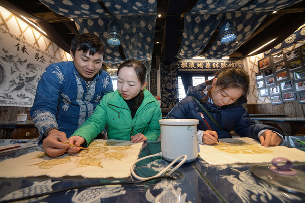 12月1日,在丹寨县金泉街道千年传蜡染制作坊,王方周(左)在指导游客画蜡画。