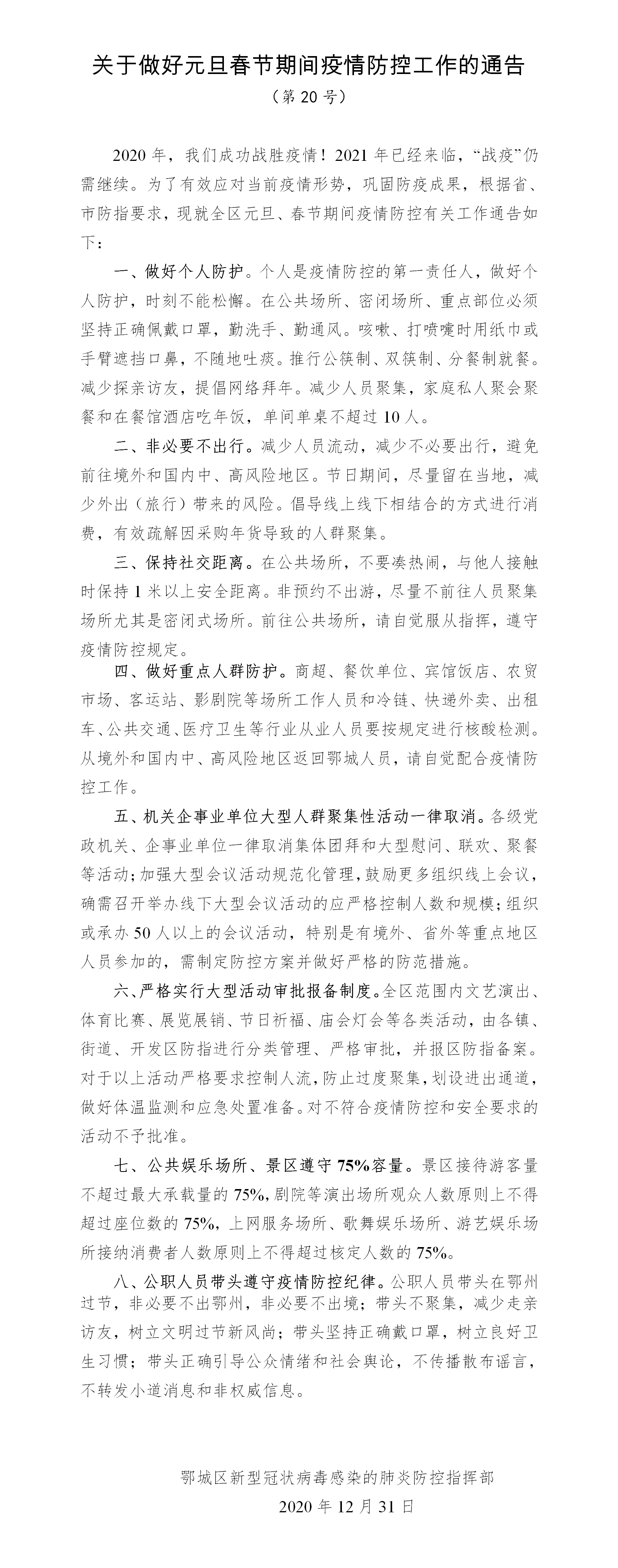 关于做好元旦春节期间疫情防控工作的通告(第20号)