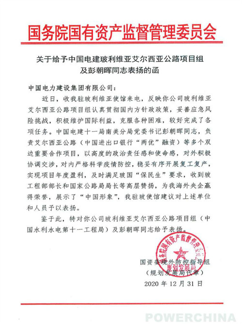 表扬函中说,近日,收驻玻利维亚使馆来电,反映你公司玻利维亚艾尔西亚公路项目组认真贯彻国内方针政策,妥善应急风险挑战,积极维护国际利益,克服各种困难,较好完成了各项任务。中国电建十一局美洲分局党委书记彭朝晖同志,负责艾尔西亚公路等多个双边重要合作项目,以高度的政治责任感和使命感,对外积极协调交涉,对内严格科学疫情防控,稳妥有序开展复工复产, 实现项目年度盈利,及时满足玻国“保民生”要求,收到玻工程部部长和国家公路局局长等高层赞扬,为我国央企在海外赢得荣誉,展示了 “中国形象”,我驻玻使馆建议对上述单位和人员予以表扬。鉴于此,特对你公司玻利维亚艾尔西亚公路项目组(中国水利水电第十一工程局)及彭朝晖同志给予表扬。