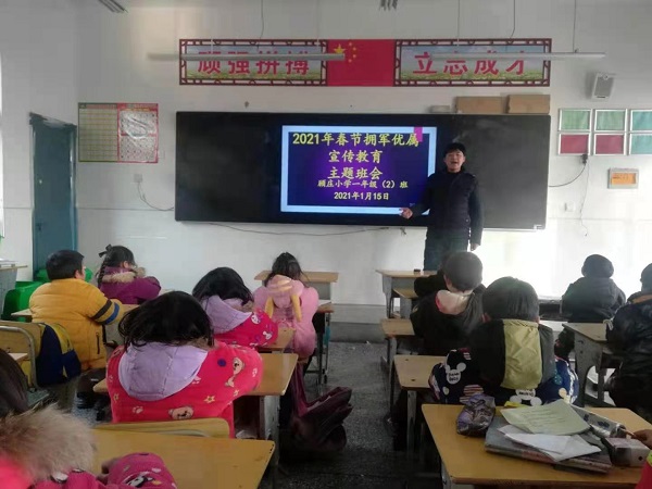 2021年1月15日顾庄小学召开2021年春节双拥宣传教育主题班会,让学生充分了解双拥的含义、来由及作用,双拥工作,是拥军优属、拥政爱民的简称,是在中国共产党的领导下,巩固和加强军政军民团结为主旨,组织发动全国军民为中国革命、建设和改革事业团结奋斗的一项社会活动。它深刻反映了中国军民血肉相连的本质特征,生动体现了党的宗旨、国家的性质和人民军队的本色,是中国党、国家和军队的优良传统和特有的政治优势。