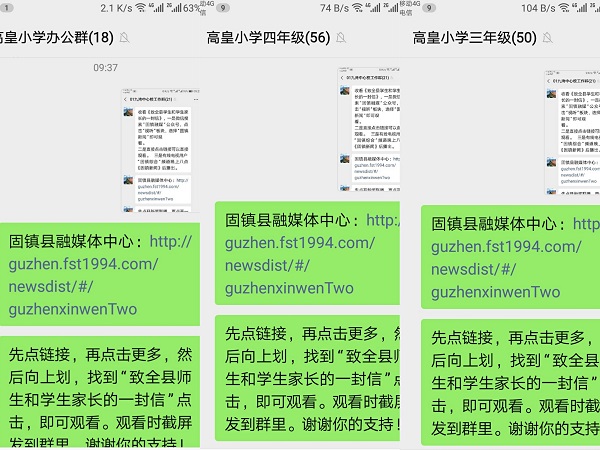 为了深入宣传固镇县教体局《致全县学生和学生家长的一封信》,按照九湾中心校的通知要求,1月17日,九湾高皇小学通过教师办公群和学生家长群,组织全体师生和家长收看固镇融媒体播出的《致全县学生和学生家长的一封信》视频。