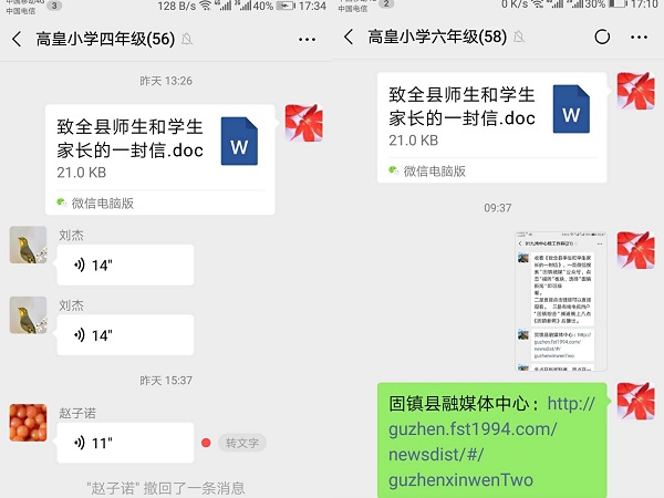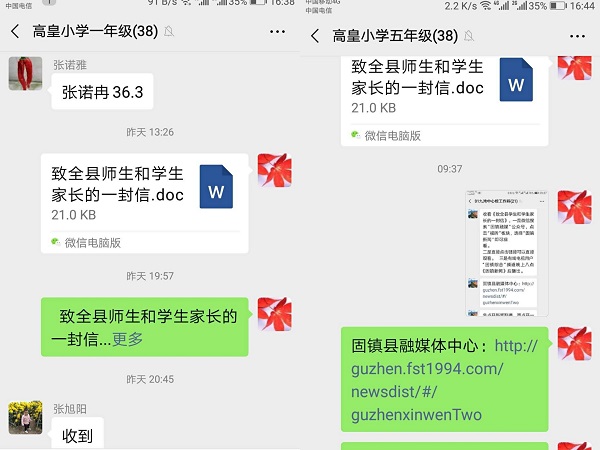 九湾高皇小学利用家长微信群广泛宣传固镇县教体局《致全县师生和学生家长的一封信》