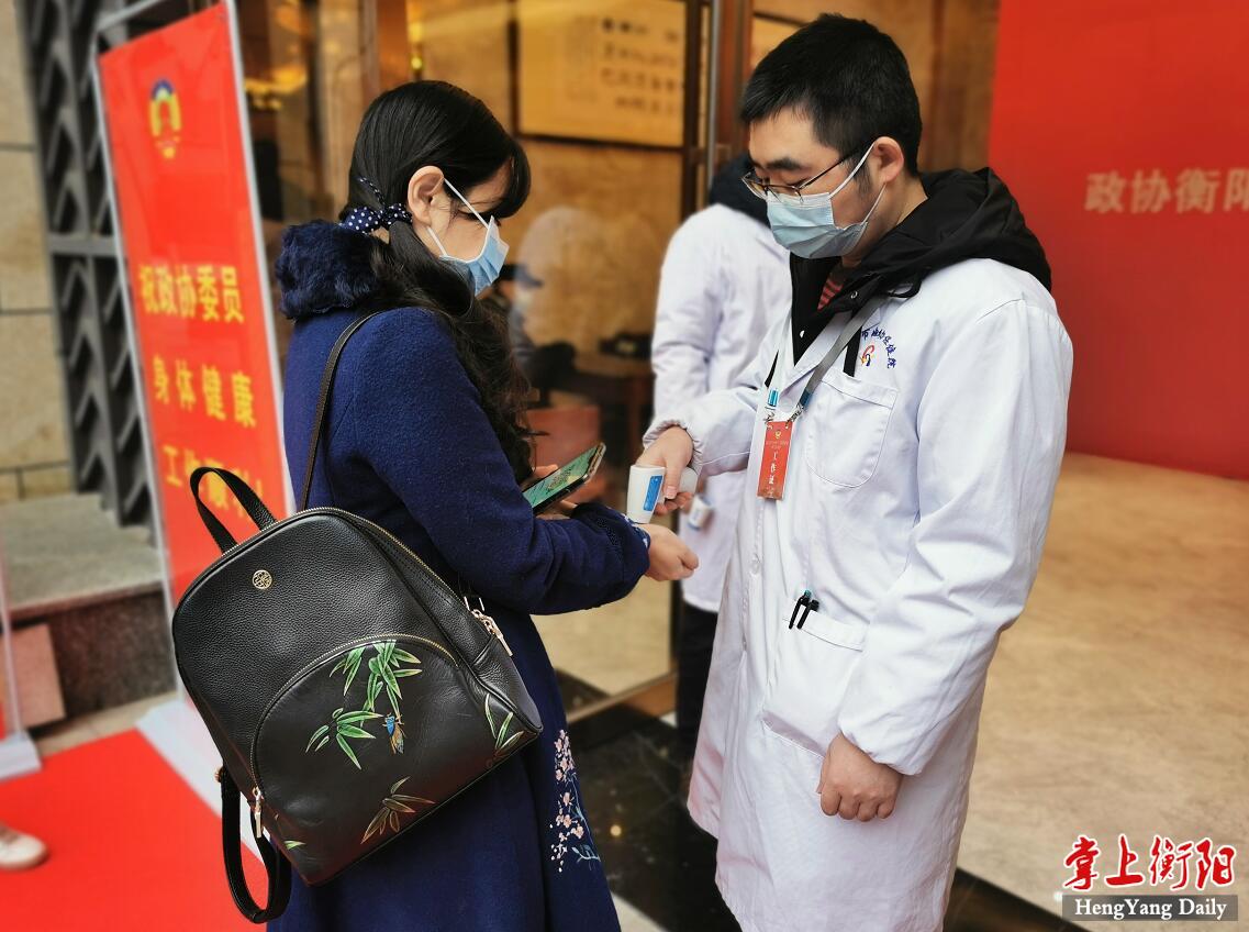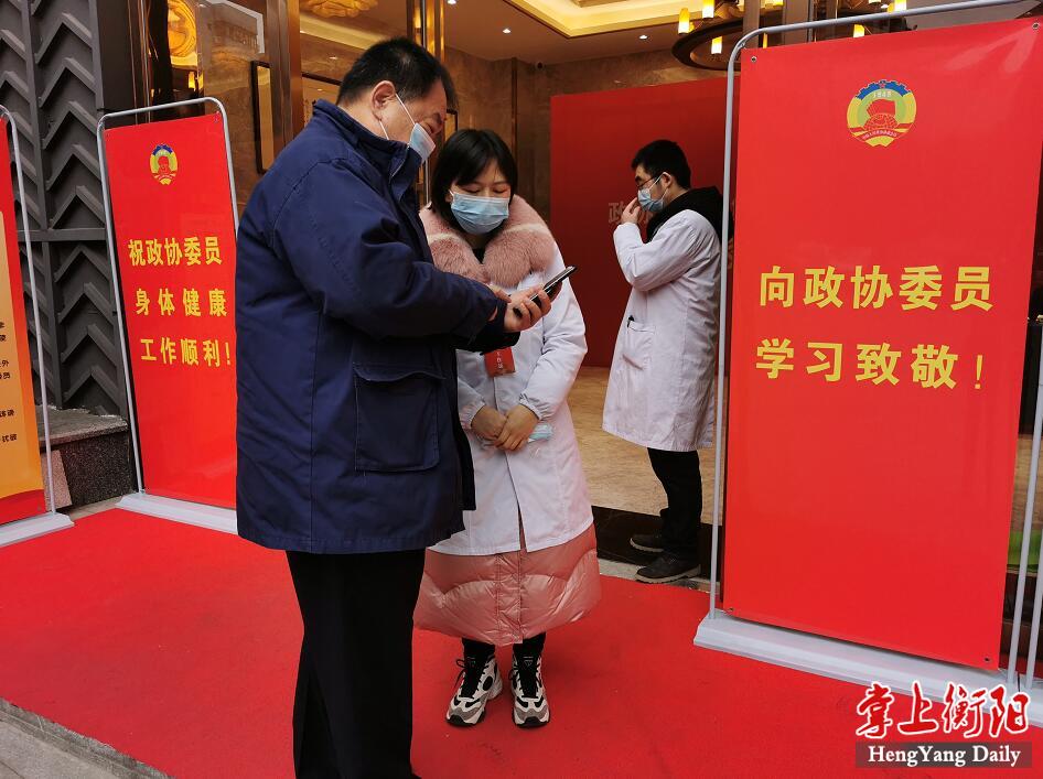 “请佩戴口罩、测量体温,出示健康码、行程码。”上午9时许,在雁城宾馆政协委员报到现场,手持体温计的工作人员守候在门口,实时监控进出人员的体温。参会人员都自觉佩戴口罩并接受体温检测,在领取材料时都自觉排队,保持“安全距离”。与往年相比,今年会场增加了许多贴心的防疫措施宣传标语,温馨提示牌、体温检测服务点、消毒液酒精等发防疫物资一应俱全。