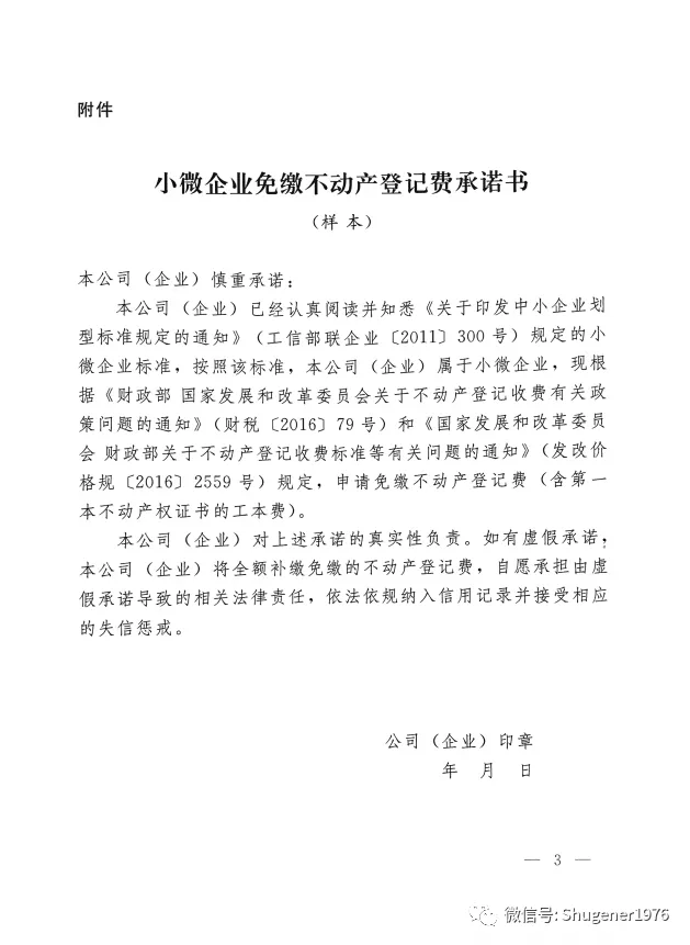据悉,不动产登记机构依据《关于印发中小企业划型标准规定的通知》(工信部联企业〔2011]300 号)规定的小微企业标准,在受理申请登记时,明确告知小微企业免收不动产登记费,并将告知内容纳入询问笔录,切实尽到告知义务。企业做出书面承诺后,不动产登记机构即免收相应的不动产登记费,不再要求企业另行提供属于小微企业的证明材料。个体工商户凭工商营业执照直接免收不动产登记费,无需承诺。做出书面承诺的企业对承诺的真实性负责,因虚假承诺产生其他法律责任的,由虚假承诺企业承担相应法律责任。(永春自然资源局 林巧玲)