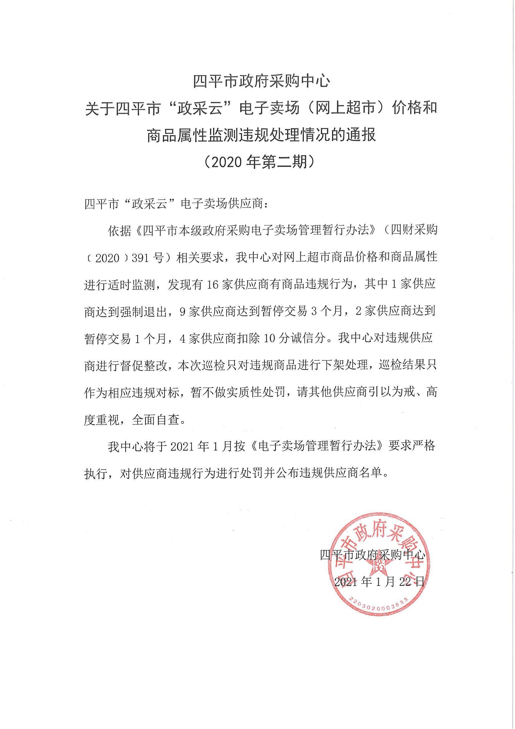 四平市政府采购中心关于四平市“政采云”电子卖场(网上超市)价格和商品属性监测违规处理情况的通报(2020年第二期)