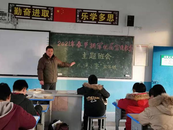 为全面落实党的十九大精神,紧紧围绕习近平总书记关于加强军政军民团结的重要决策指示,进一步密切“同呼吸、共命运、心连心”的军政军民关系,1月21日,九湾小学组织各年级召开春节拥军优属宣传教育主题班会。
