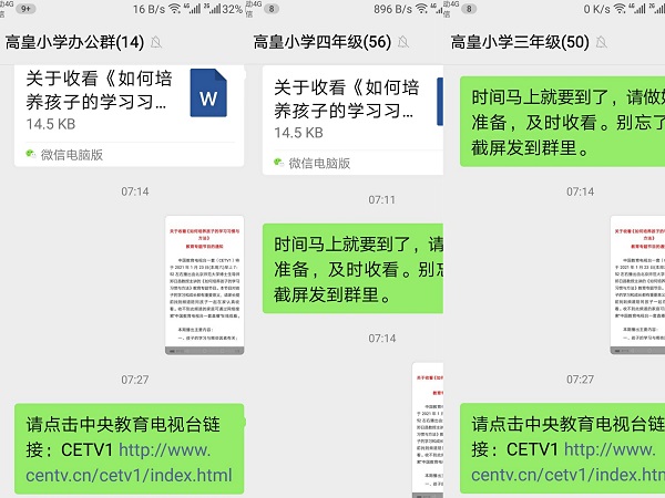 为了培养孩子的学习习惯与方法,按照关于收看《如何培养孩子的学习习惯与方法》教育专题节目的通知要求,2021年1月23日,九湾高皇小学通过学校微信群,组织全体师生和家长收看由中国教育电视台一套(CETV1)于1月23日早上7:52左右,播出的《如何培养孩子的学习习惯与方法》教育专题节目,此次主讲的嘉宾是北京师范大学博士生导师郑日昌教授。