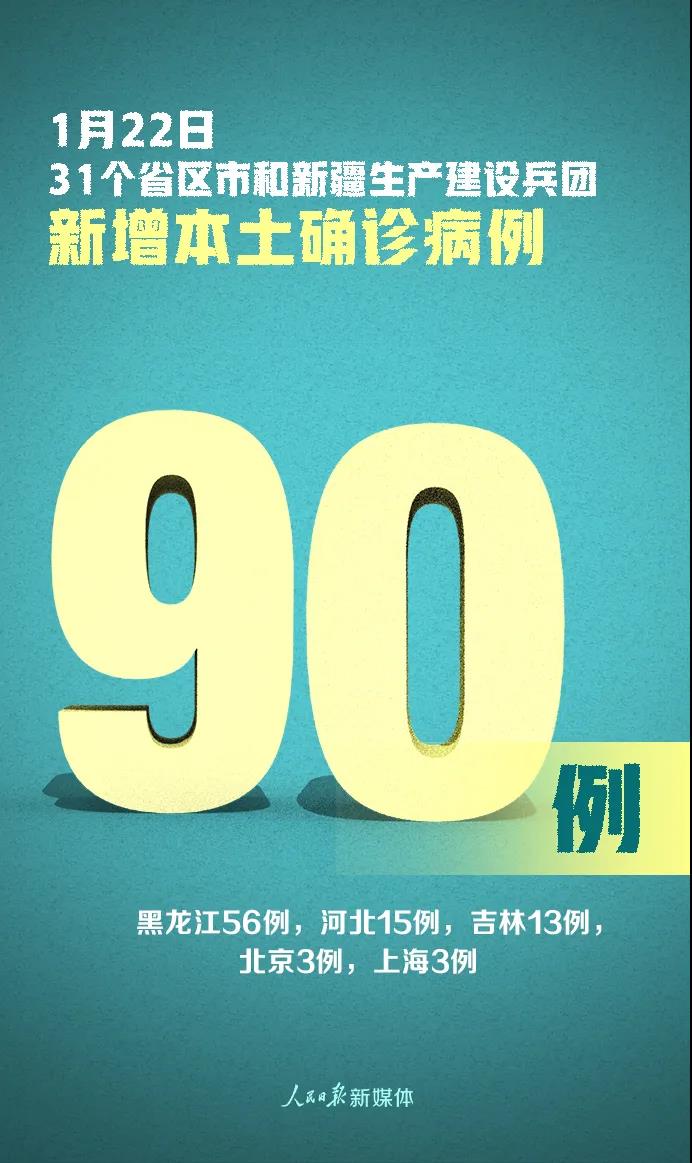 1月22日0—24时,31个省(自治区、直辖市)和新疆生产建设兵团报告新增确诊病例107例,其中境外输入病例17例(上海8例,山西4例,江苏2例,湖南1例,广东1例,四川1例),本土病例90例(黑龙江56例,河北15例,吉林13例,北京3例,上海3例);无新增死亡病例;新增疑似病例2例,其中境外输入病例1例(在上海),本土病例1例(在上海)。