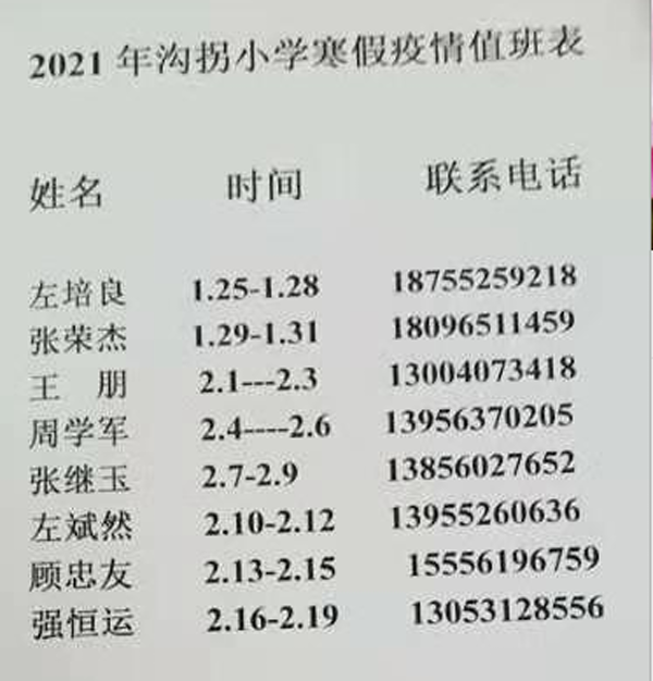 为严格落实疫情防控工作,切实做好本校寒假期间疫情防控工作,巩固校园常态化疫情防控成果,防止疫情传播扩散。沟拐小学制定寒假假期期间值班小组。组长左培良,副组张荣杰,组员王朋,周学军,张继玉。左斌然,顾忠友,强恒运。