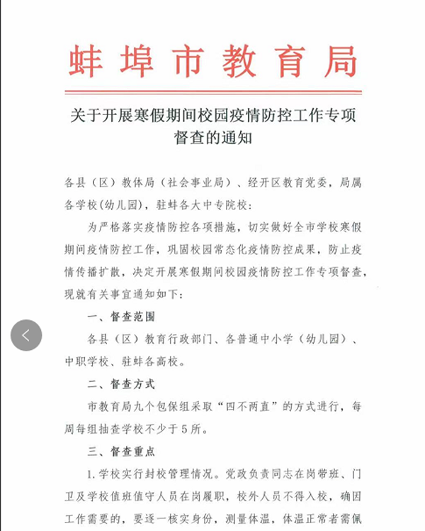 为积极响应蚌埠市教育局“关于开展寒假假期校园疫情防控工作专项督查的通知”的文件精神。