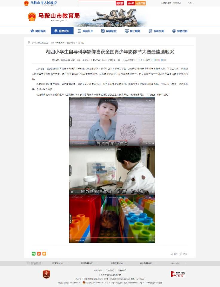 201班钱奕燃同学自导自演的科学影像《仓鼠走迷宫》代表安徽省参赛全国青少年科学影像节,从7000个作品中脱颖而出,荣获全国青少年影像节最佳选题奖,成为安徽省唯一问鼎最佳奖的作品。钱奕燃也是26个最佳奖中年龄最小的创作者。